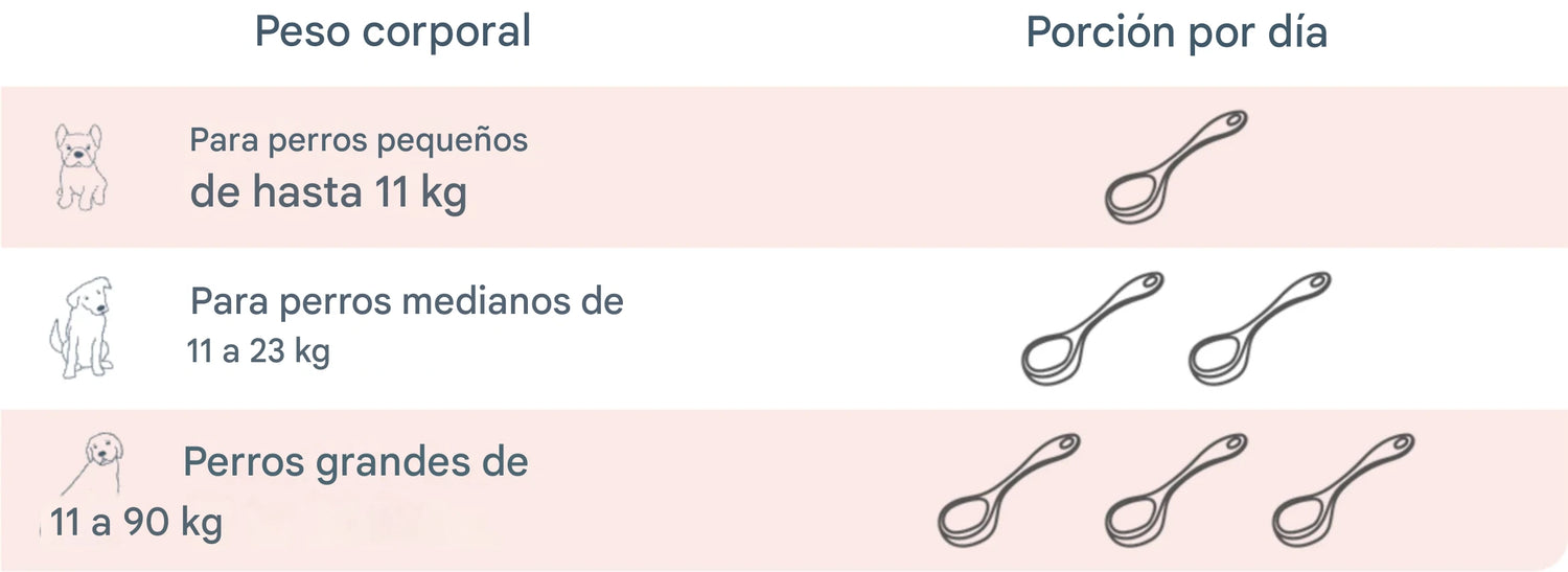 Cada perro es diferente, por eso este suplemento está dosificado por peso corporal, asegurando un apoyo efectivo y seguro sin importar su tamaño.